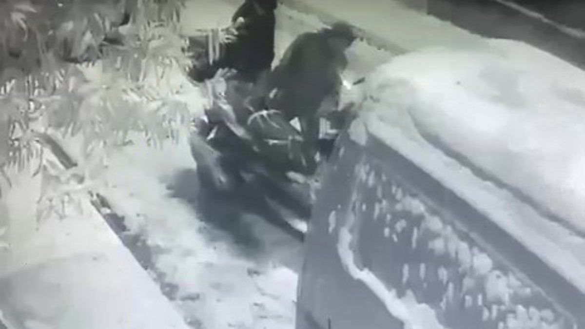 Motosikletin alarmını kesen hırsızlar, üzerindeki karları temizledikleri motosikleti çalarak kaçtı. Yaşanan hırsızlık anları is güvenlik kamerasına saniye saniye yansıdı.