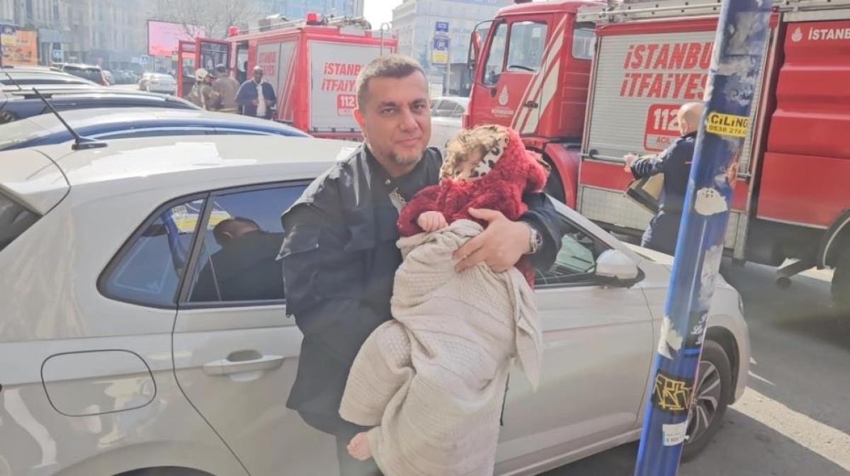 Otelin 5'inci katında kalan turist bir baba, dumandan etkilenmesin diye çocuğunu battaniyeye sarıp dışarı çıkardı.