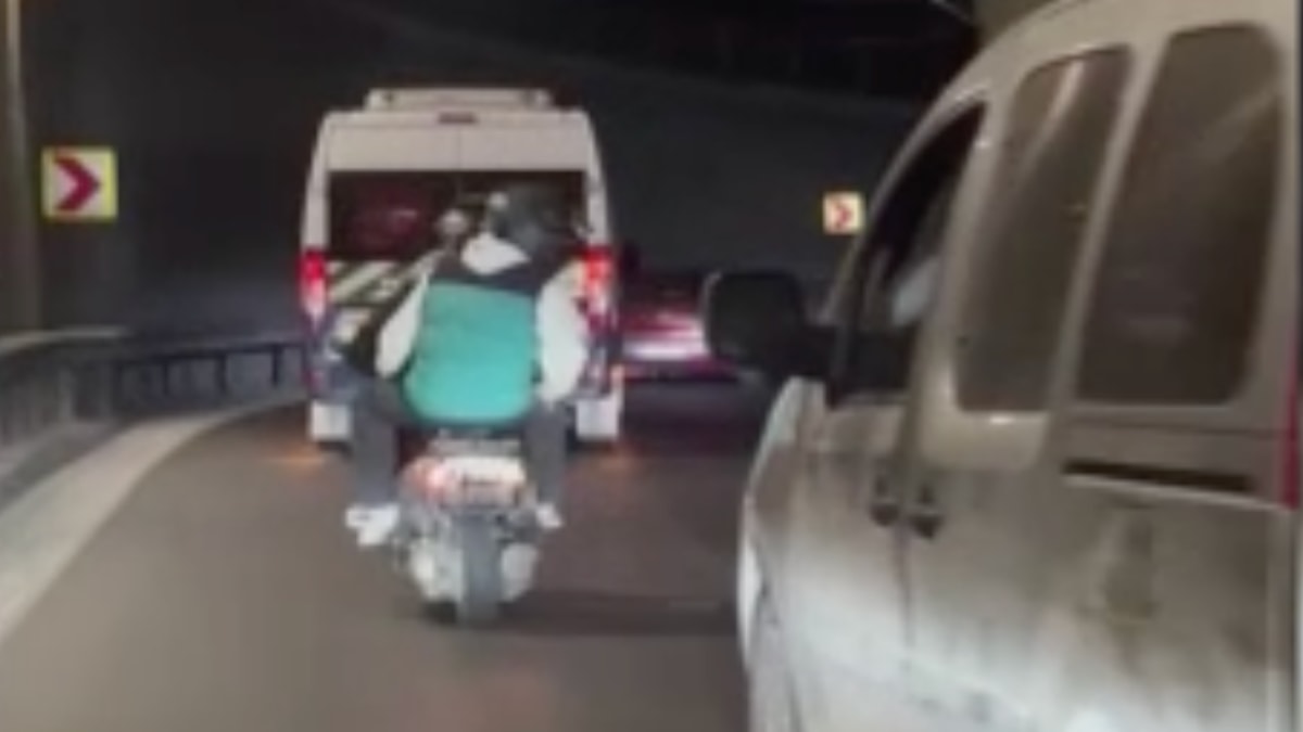 Motosikletle araçların arkalarına yaklaşarak manevra yapan kişiler, zaman zaman önlerine geçtikleri araçları yavaşlattı.