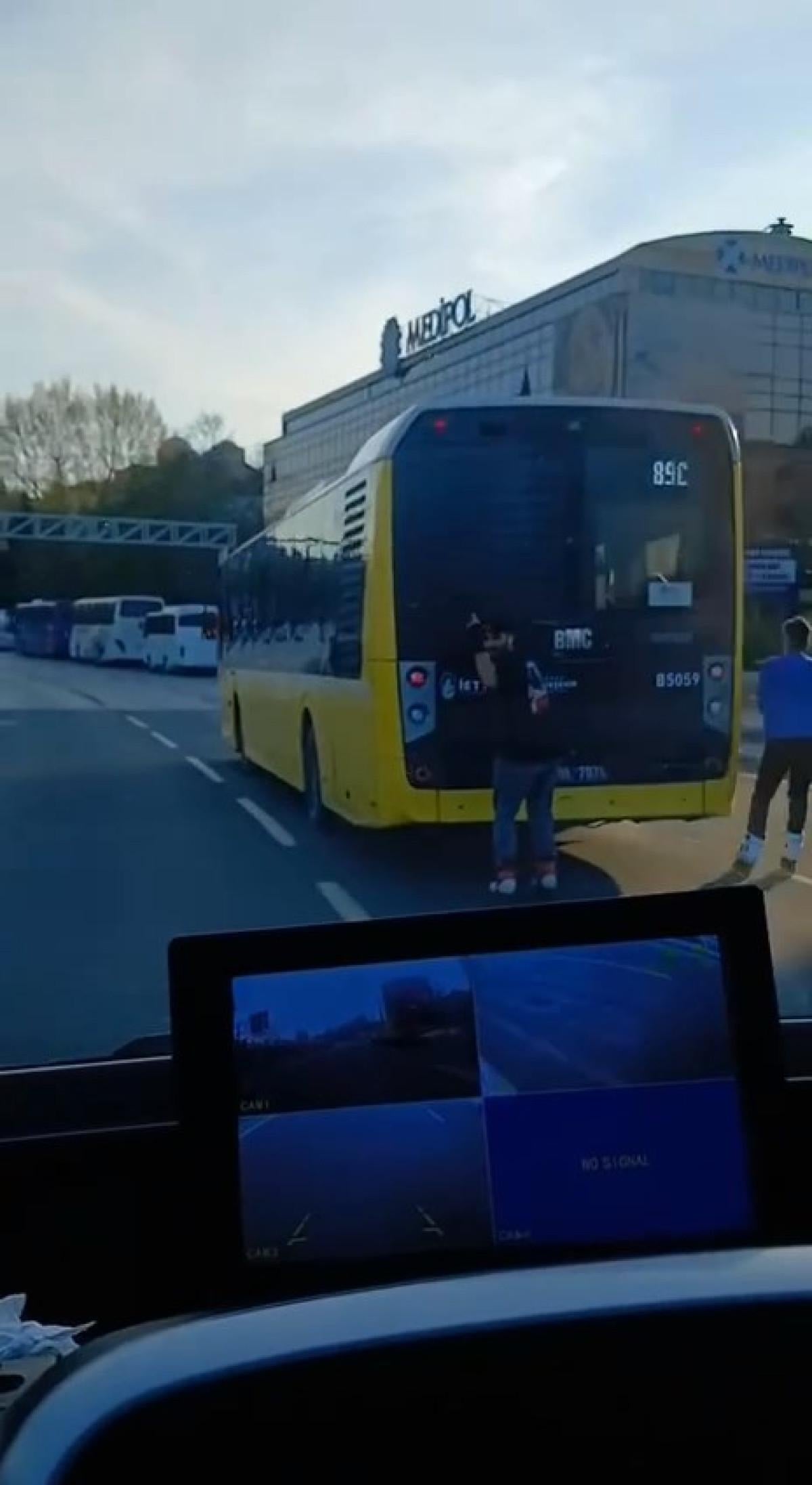 Cadde üzerinde paten kayan iki genç, seyir halindeki İETT otobüsüne tutunarak ilerledi.