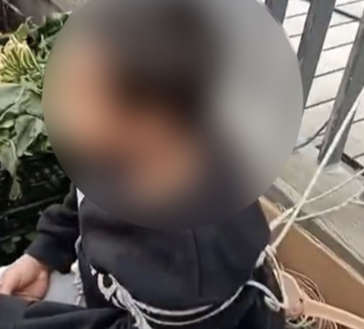 Görüntülere çocuğun iple bağlandığı anlar yansıdı.
