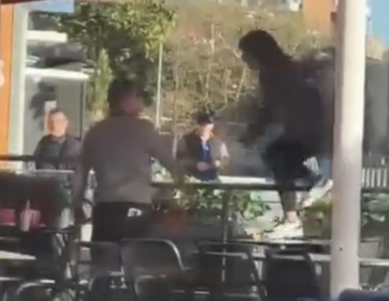Kağıthane'de Çağlayan Meydanı'nda bulunan bir restoranda iki grup arasında kavga çıktı. Taraflardan biri diğer gruptakilere sandalye fırlattı. Sandalye atan taraftaki kadın korkulukları aşarak masanın üstüne atladı. Kavga anı cep telefonu kamerasına yansıdı.