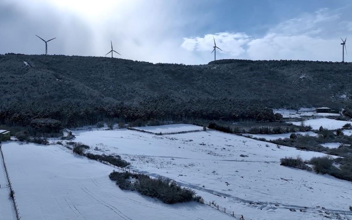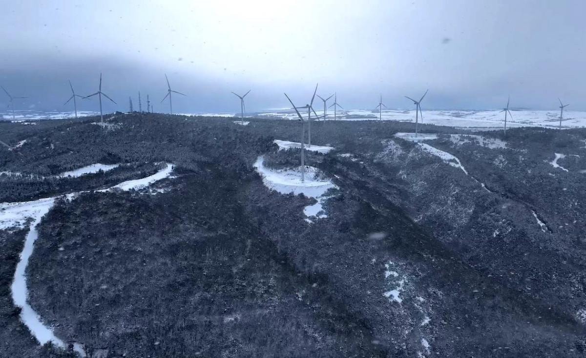 İstanbul'da etkili olan kar yağışının ardından Çatalca'da 200 metreyi aşan dev rüzgargülleri beyaza büründü.