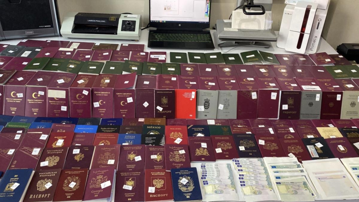 Adreste yapılan operasyonda 47 ülkeye ait 330 adet sahte pasaport, 21 ülkeye ait 230 adet sahte kimlik kartı ve sürücü belgesi, 10 ülkeye ait bin 132 adet sahte vize etiketi, 3 adet mor ışık cihazı ele geçirildi.