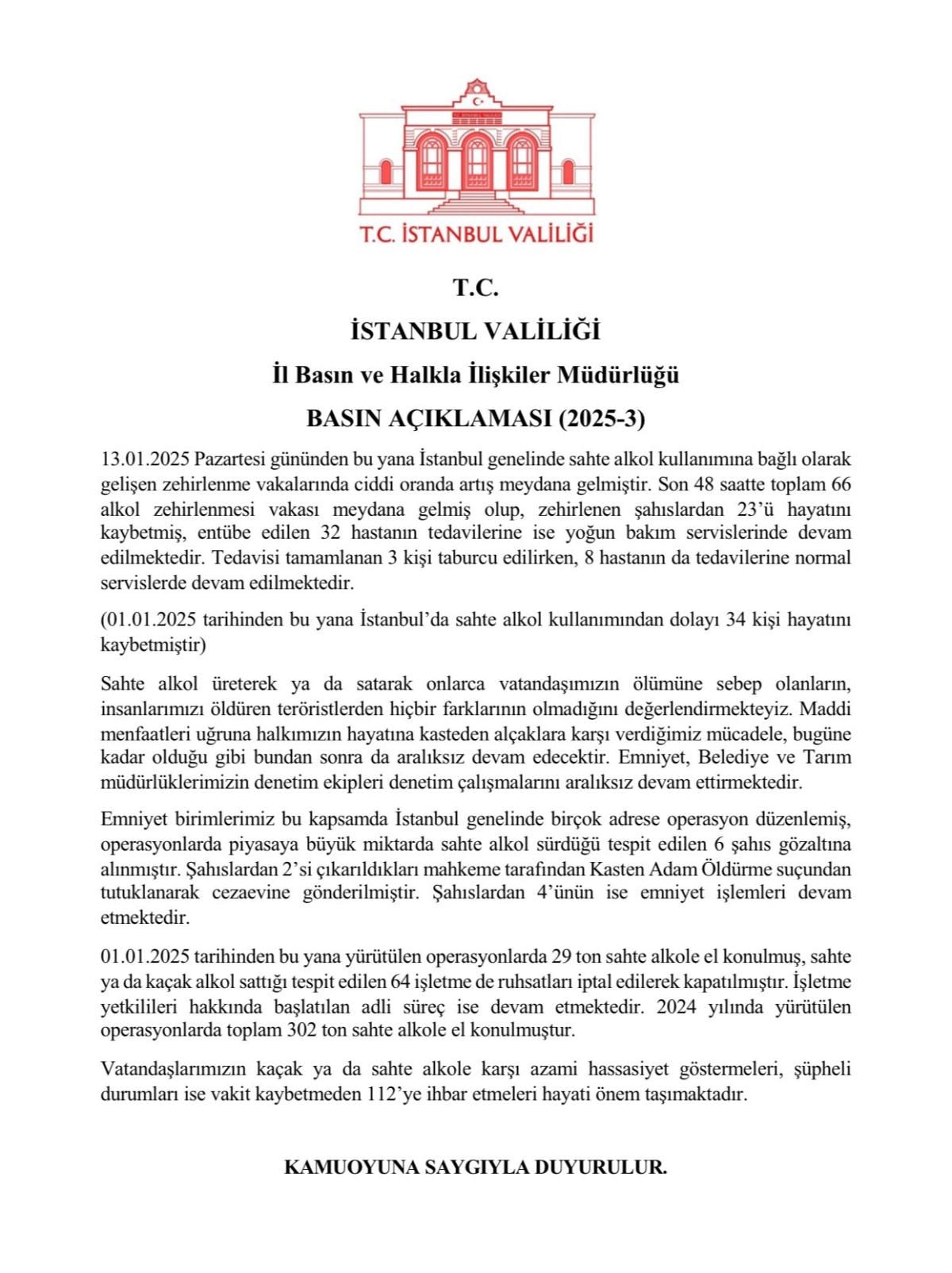 (01.01.2025 tarihinden bu yana İstanbul’da sahte alkol kullanımından dolayı 34 kişi hayatını kaybetmiştir)