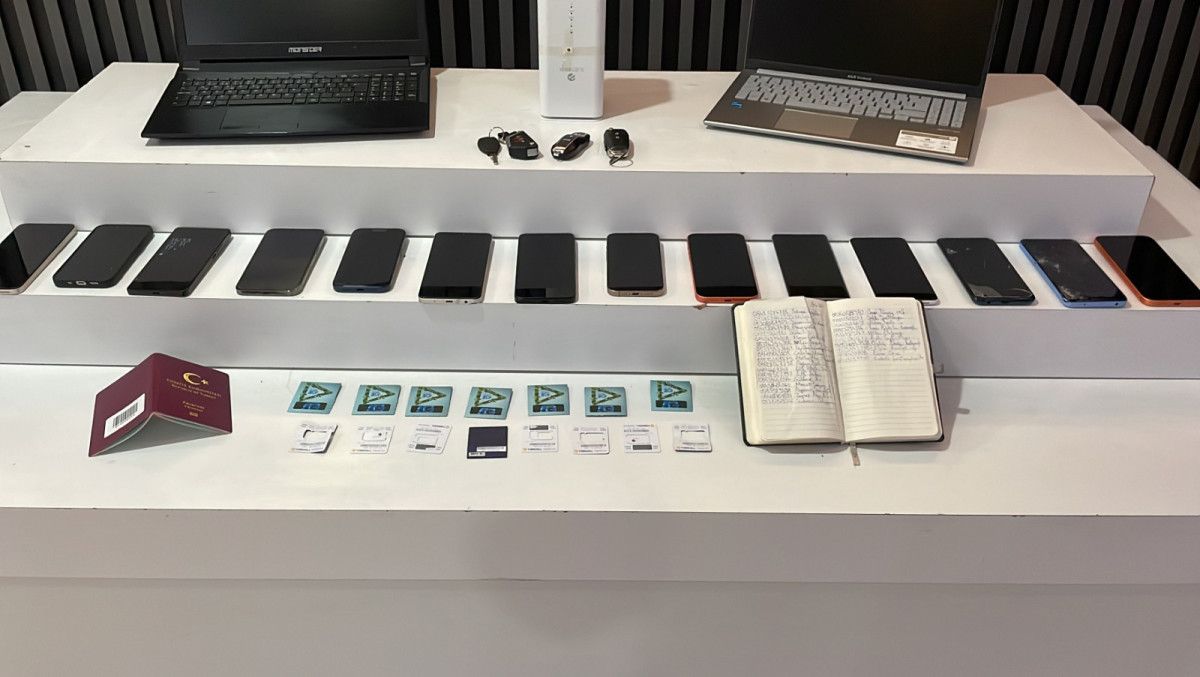 Evde yapılan aramalarda 14 adet cep telefonu, 20 sim kart, 2 bilgisayar ve içerisinde çok sayıda iletişim numarası bulunan ajanda ele geçirildi.