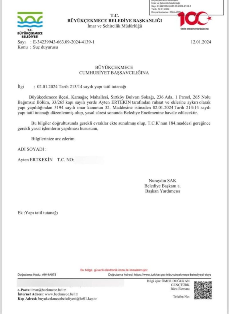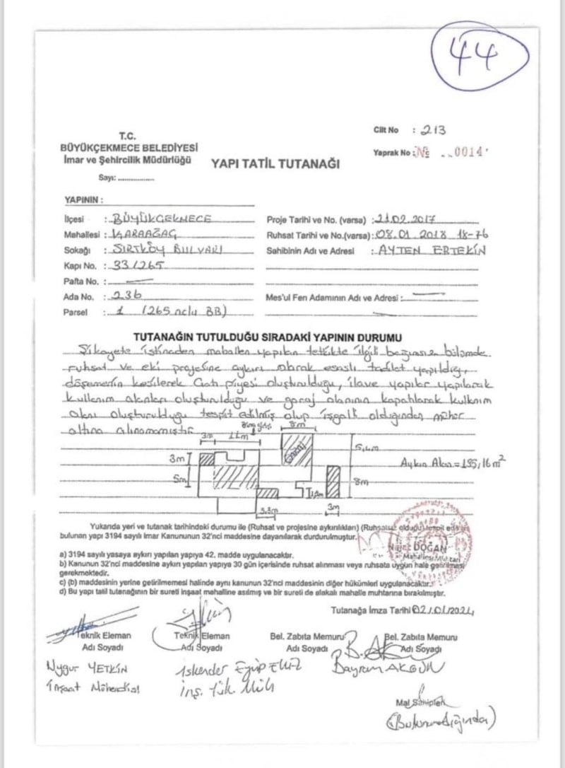 3194 sayılı İmar Kanunu kapsamında 2 Ocak 2024 ve 13 Mart 2024 tarihli Yapı Tatil Tutanağı ve 13 Mart 2024 tarihli 217/9 sayılı Yapı Tatil Tutanağı düzenlenerek yasal işlem başlatıldı.