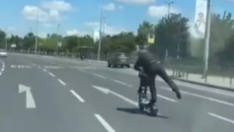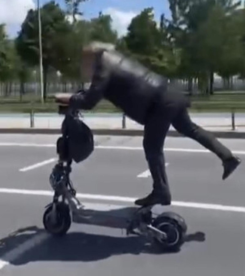 Kayda alınan görüntülerde, elektrikli scooterla yolculuk yapan bir kişinin tehlikeli hareketlerde bulunduğu görüldü.