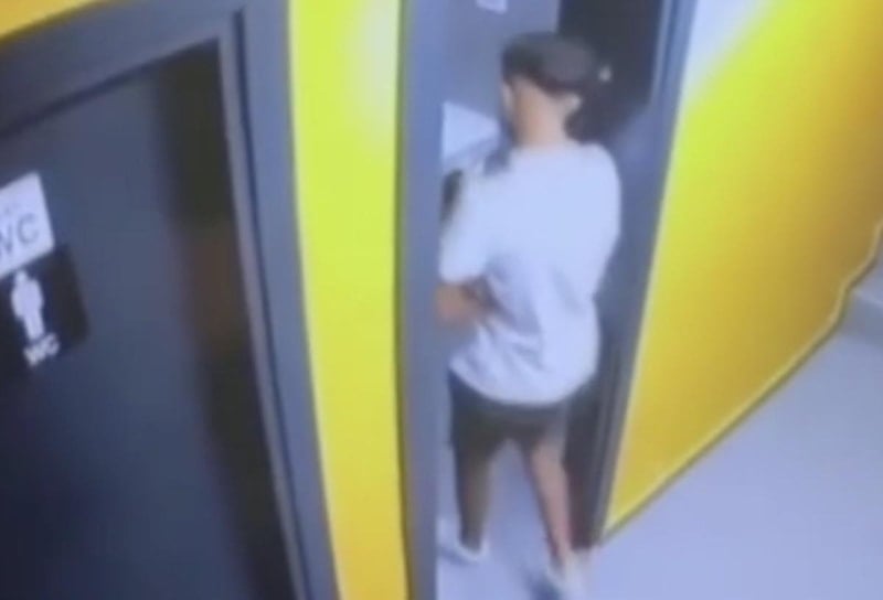 Kız arkadaşının tuvalet kapısını açmasıyla telefonu alan şüpheli şahıs, koşarak erkekler tuvaletine girdi.