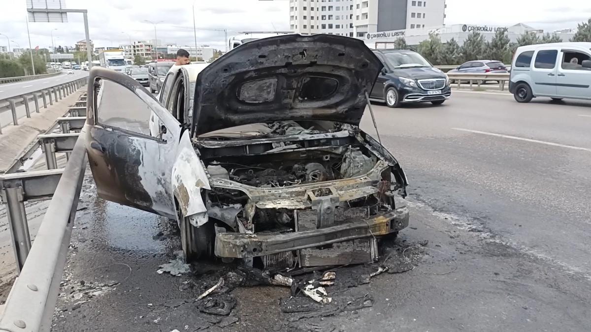 Aracını emniyet şeridine çeken sürücü, kendini dışarı atarak durumu itfaiyeye bildirdi.