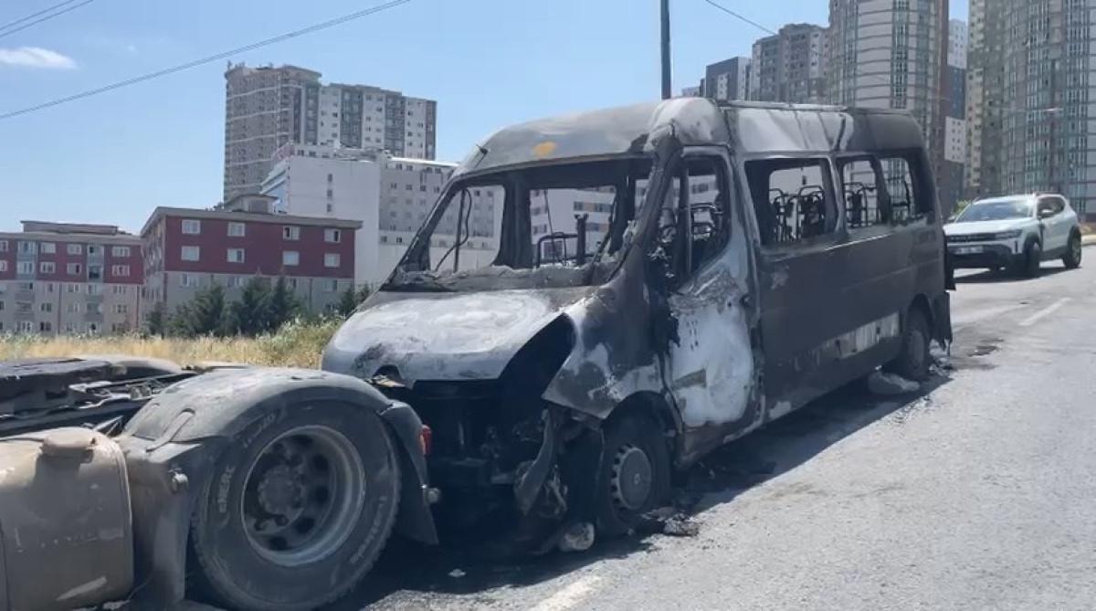 Servis minibüsü yangının ardından demir yığınına dönerken tırın dorsesi kısmen yandı.