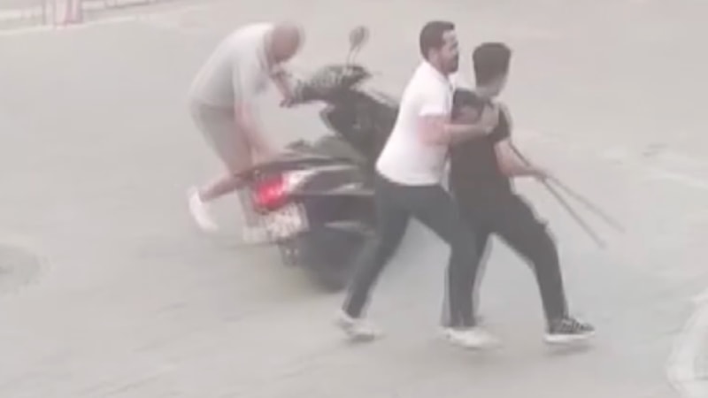 Elindeki sopa parçasıyla motosikletli adama saldıran genç, bir adamın müdahalesiyle durduruldu.
