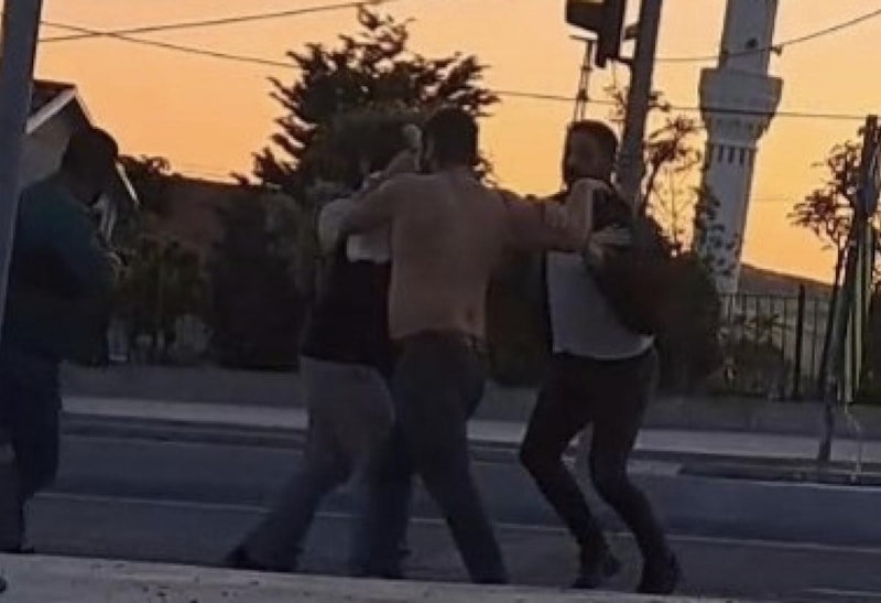 Görüntülerde iki kişinin birbirine saldırdığı ve birinin tişörtünün yırtılarak üzerinden çıktığı görüldü.