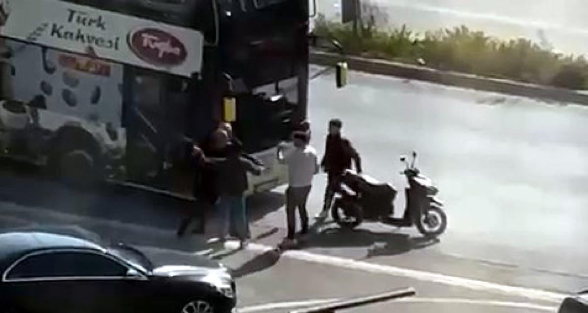 Tahtakale Mahallesi Ispartakule Bulvarı'nda aynı yönde ilerleyen İETT otobüsünün şoförü ile bir motosiklet sürücüsü arasında yol verme nedeniyle tartışma çıktı.