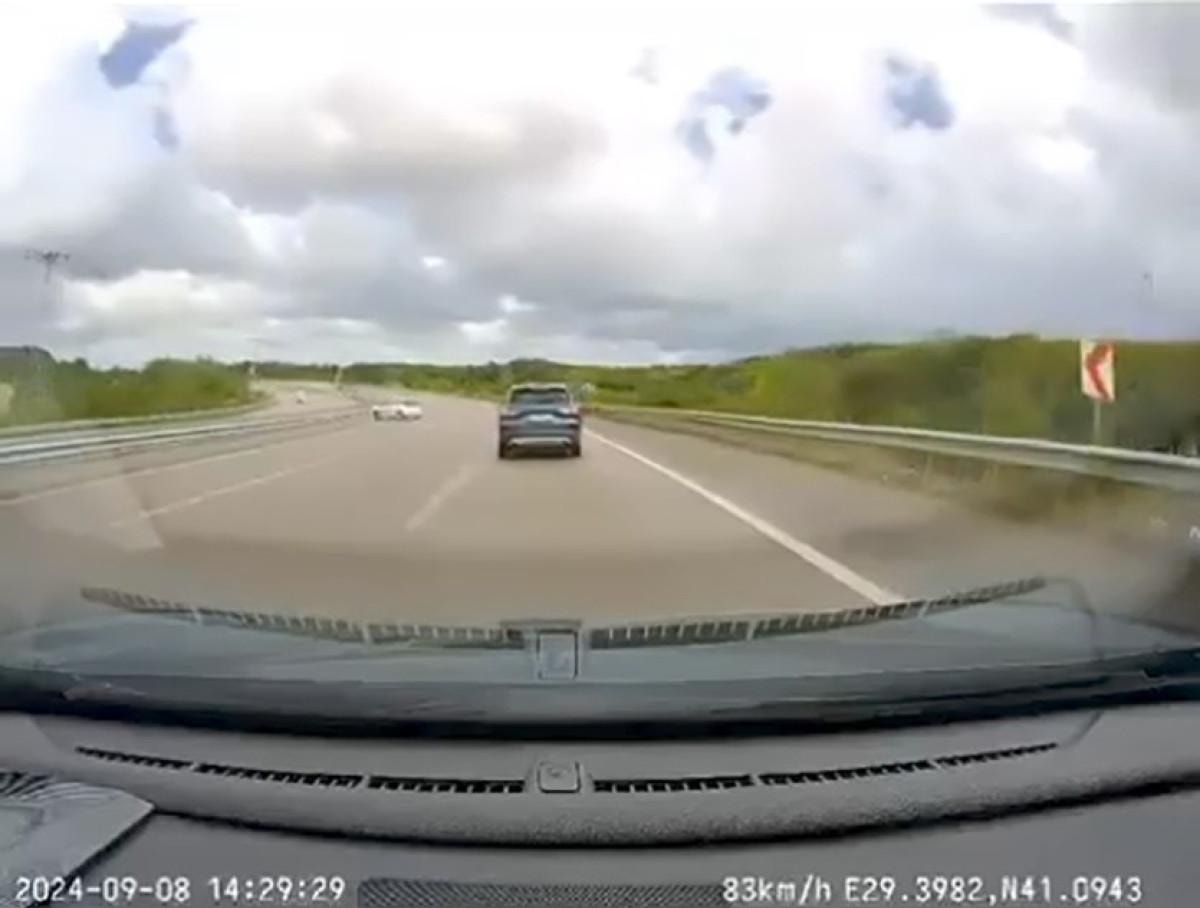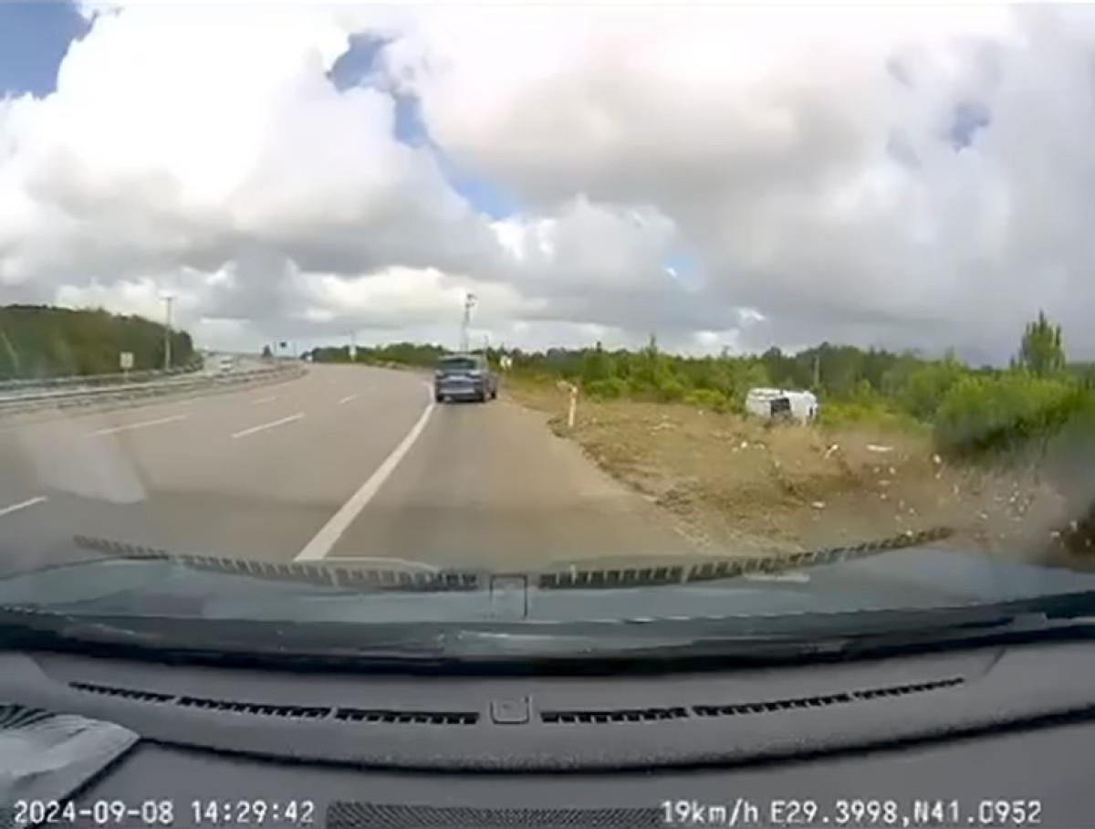 Kaza anı ise arkada seyir halinde olan otomobilin araç kamerasına yansıdı. Görüntülerde sol şeritte hızla giden otomobilin kayarak ters döndüğü, ardından takla atarak ağaçlık alana savrulduğu görülüyor.