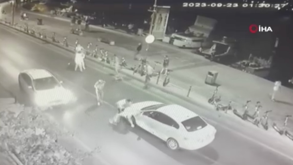 Görüntülerde, iki gencin yolun karşısından kaldırma gelip diğer grupla karşılaştığı ve aralarında bir arbede olduğu görülüyor.