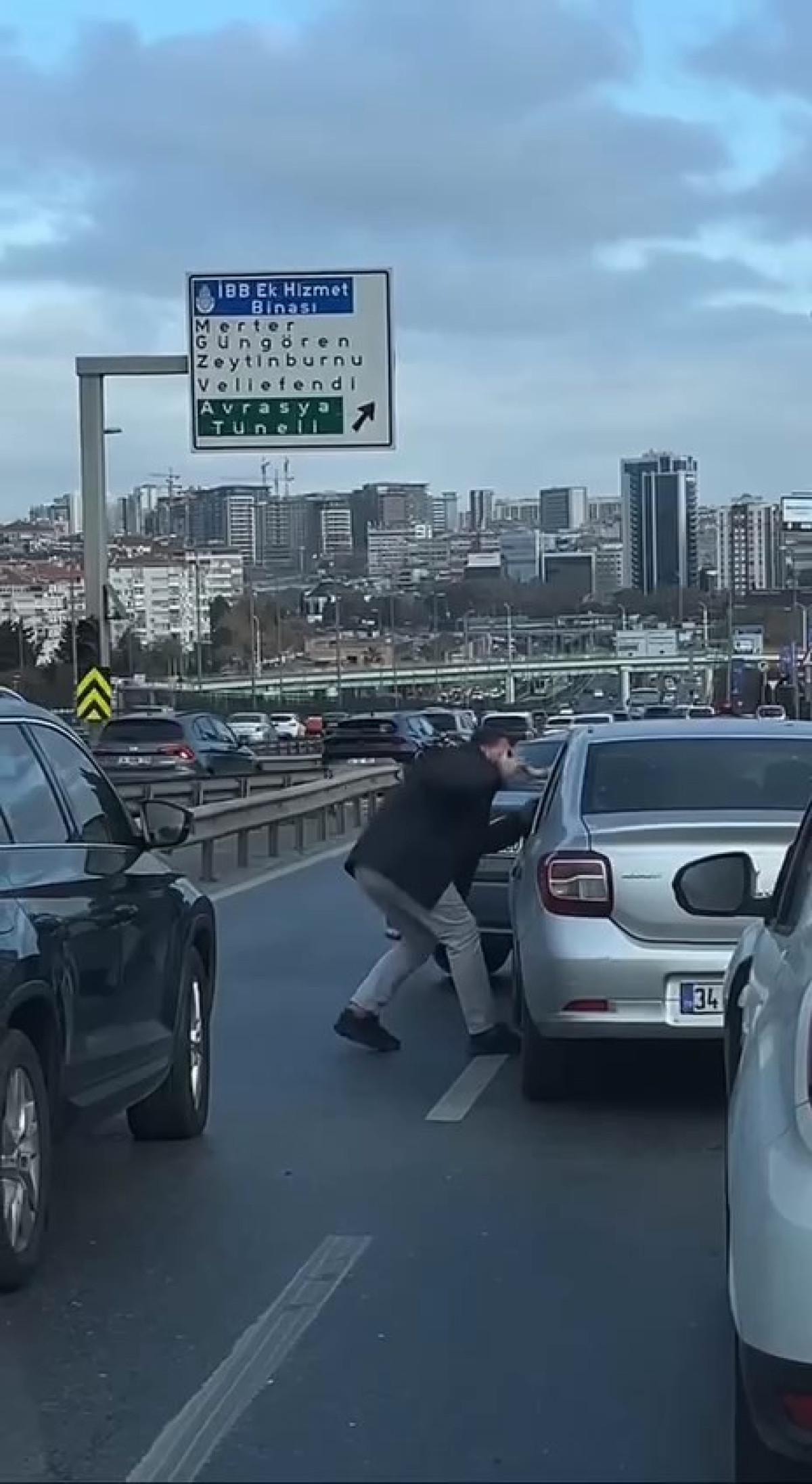Aracından inen sürücü diğer sürücünün camına yumruk attı. Aracının camı yumruklanan sürücü bir süre sonra aşağı indi.