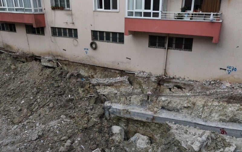 5 katlı bina, sabahın ilk ışıklarıyla birlikte havadan görüntülendi. Çekilen drone görüntülerinde, tahliye edilen binanın altındaki toprak kaymasını ve temel ile zemin arasındaki açıklık net bir şekilde kaydetti.