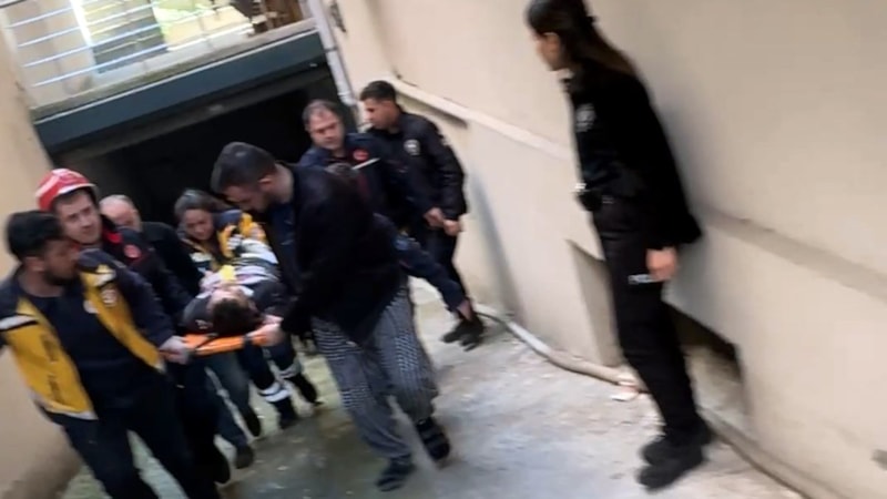İtfaiye merdivenine bağlanan yaralı, gerekli önlemler alındıktan sonra pencereden dışarı çıkartılarak sağlık görevlilerine teslim edildi.