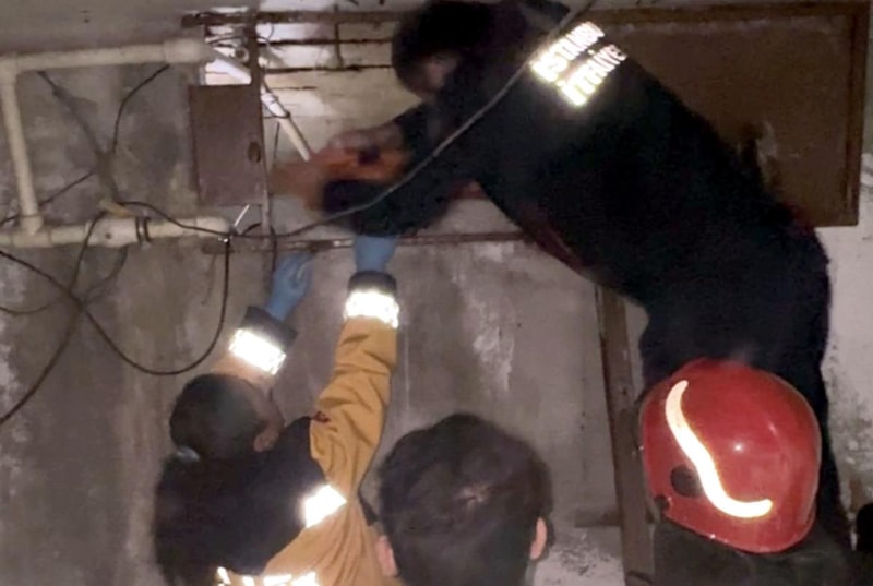 Arkadaşlarının desteği ile içeri sarkarak giren itfaiyeciye diğer arkadaşı da arkasından aynı şekilde giderek destek verdi.