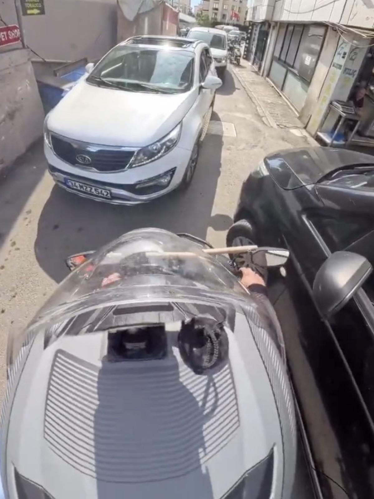 "Ters yönden girmeyeceksin ağabey o zaman" diyen sürücüye "Sana ne lan" diye bağıran sürücüye moto kurye, "Akşam izlersin kendini. Hem tersten gelip hem de tehdit ediyor." dedi.