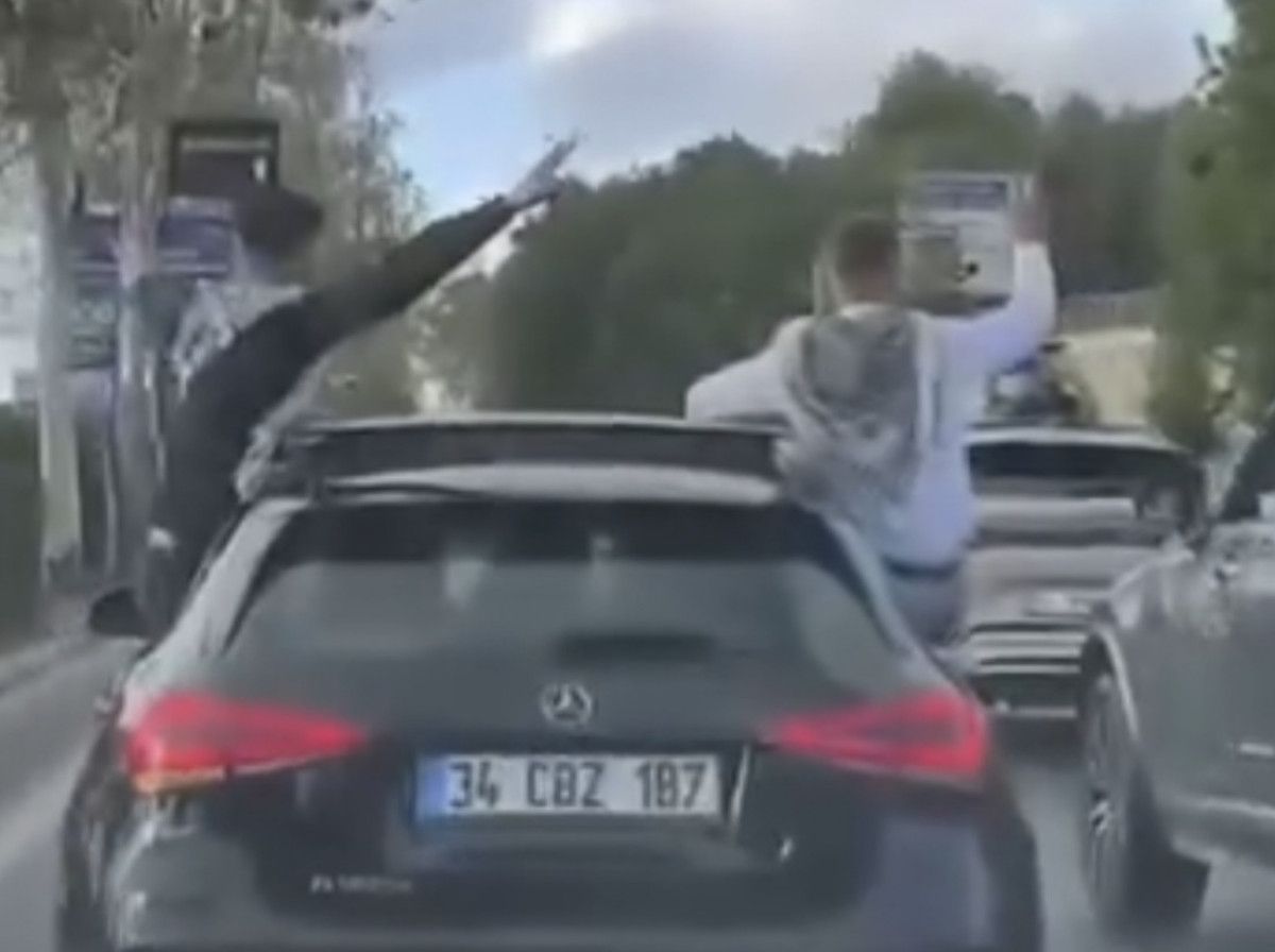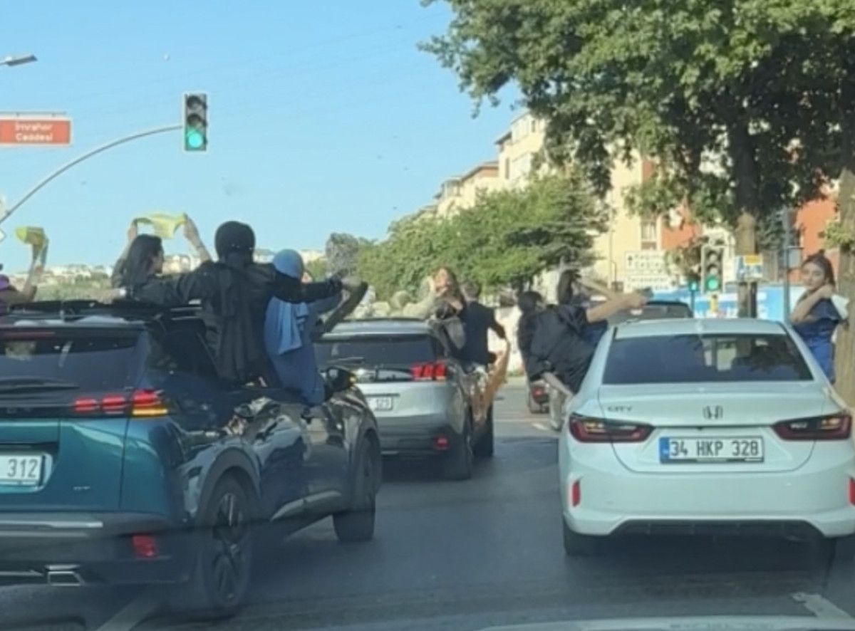 Kağıthane İmrahor Caddesi'nde araçlarla konvoy halinde ilerleyen bir grup ise, araçların camlarından sarktı.