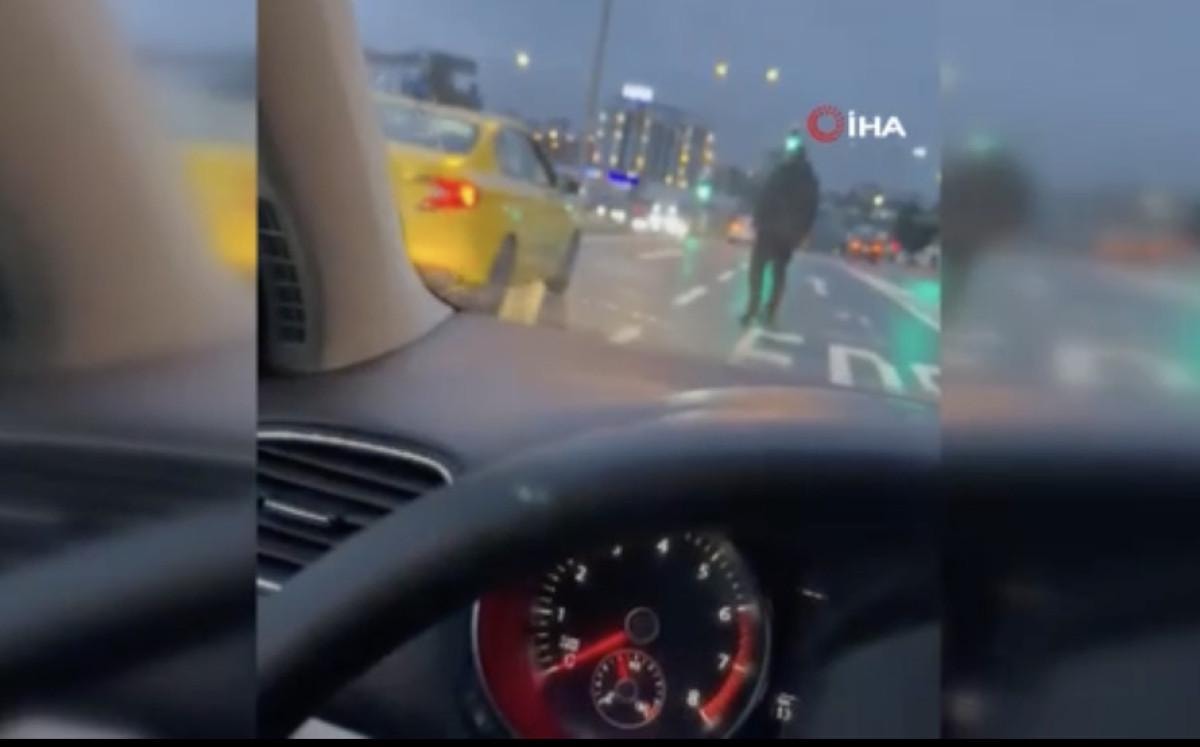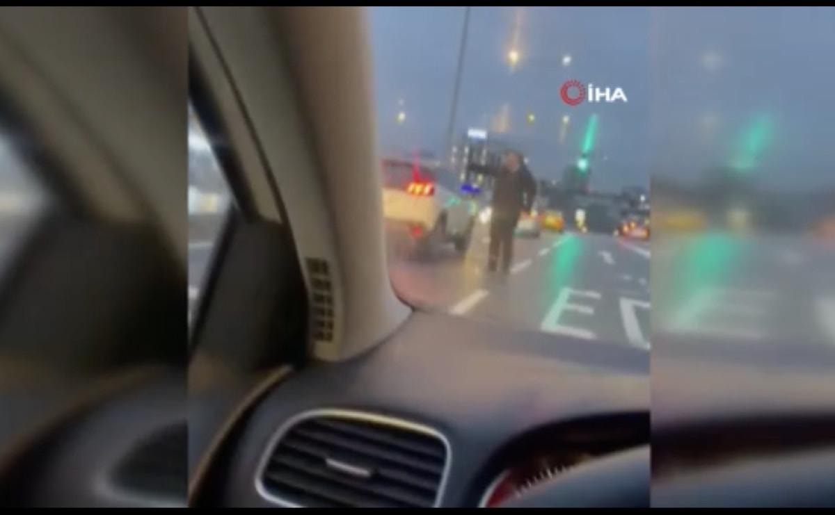 İstanbul Başakşehir'de dün akşam saatlerinde trafikte tartışan iki araç sürücüsü bir müddet inatlaştıktan sonra sürücülerden biri, diğerinin önünü kesti.