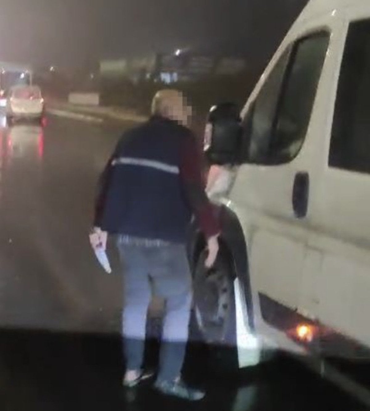 Görüntülerde, sürücünün elinde bıçakla servis aracına yaklaştığı, çevredekilerin ise olaya şaşkınlıkla tepki verdiği görüldü.