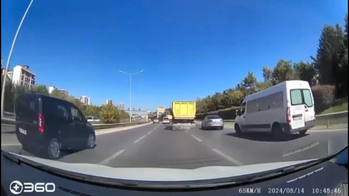 Kamyon şoförü, tartıştığı sürücünün otomobilini sıkıştırdı. Otomobil sürücüsü kaza yapmaktan son anda kurtulurken, trafikte yaşanan o korku dolu anları araç kamerası kaydetti.