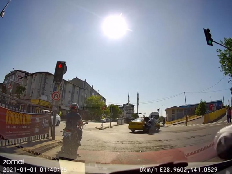 Şişli'de U dönüşü yaptığı sırada bir motosiklet sürücüsü ile çarpışarak yaralanmasına neden olan taksicinin karıştığı kaza, anbean güvenlik kameralarına yansıdı.