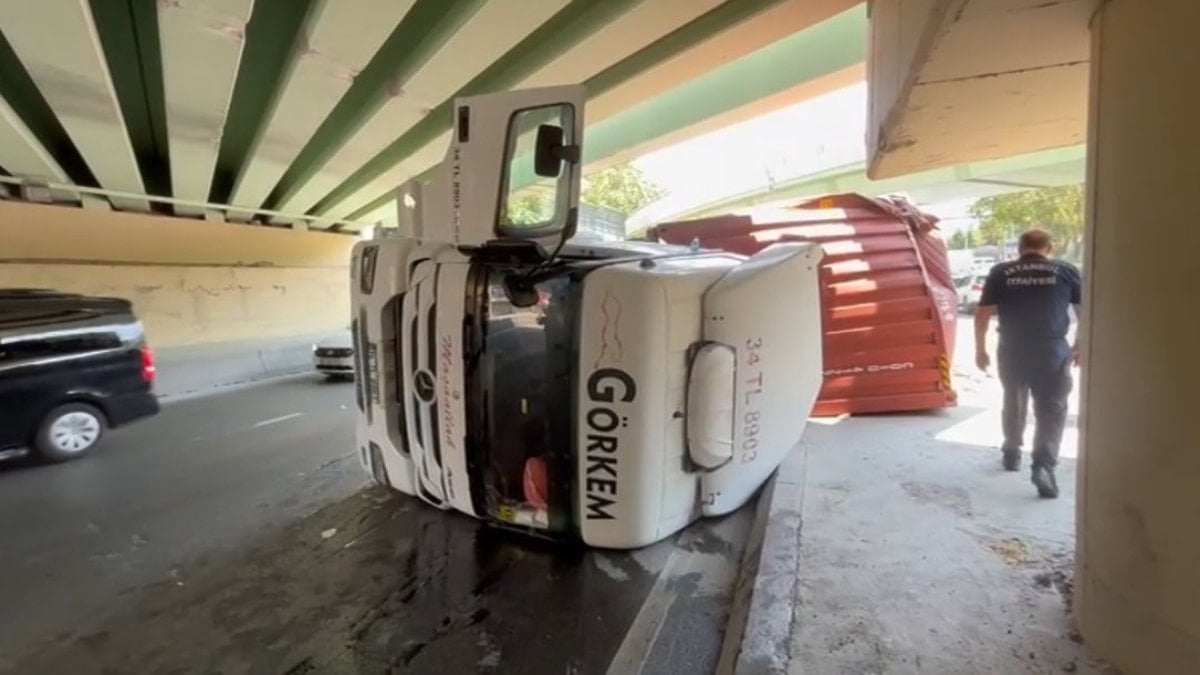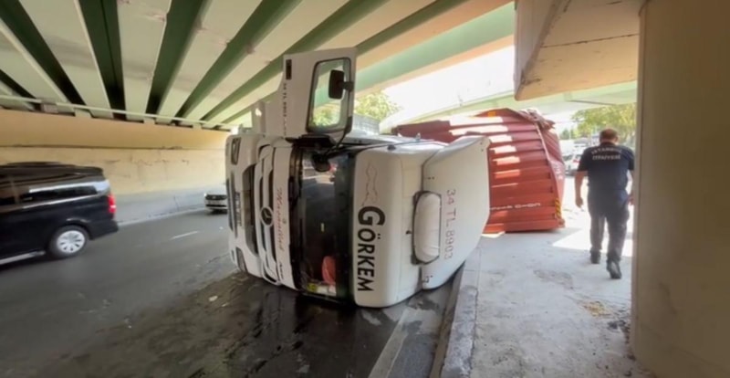 Bakırköy'de üst geçide çarparak devrilen tırın sürücüsü Fatih D., hafif yaralanırken, bölgede ise trafik yoğunluğu oluştu.