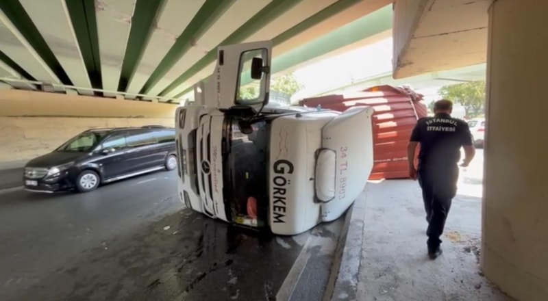 Bakırköy Rauf Orbay Caddesi'nde saat 12.30 sıralarında Fatih D. yönetimindeki tekstil malzemesi taşıyan plakalı tır, üst geçide çarptı ve akabinde de devrildi.