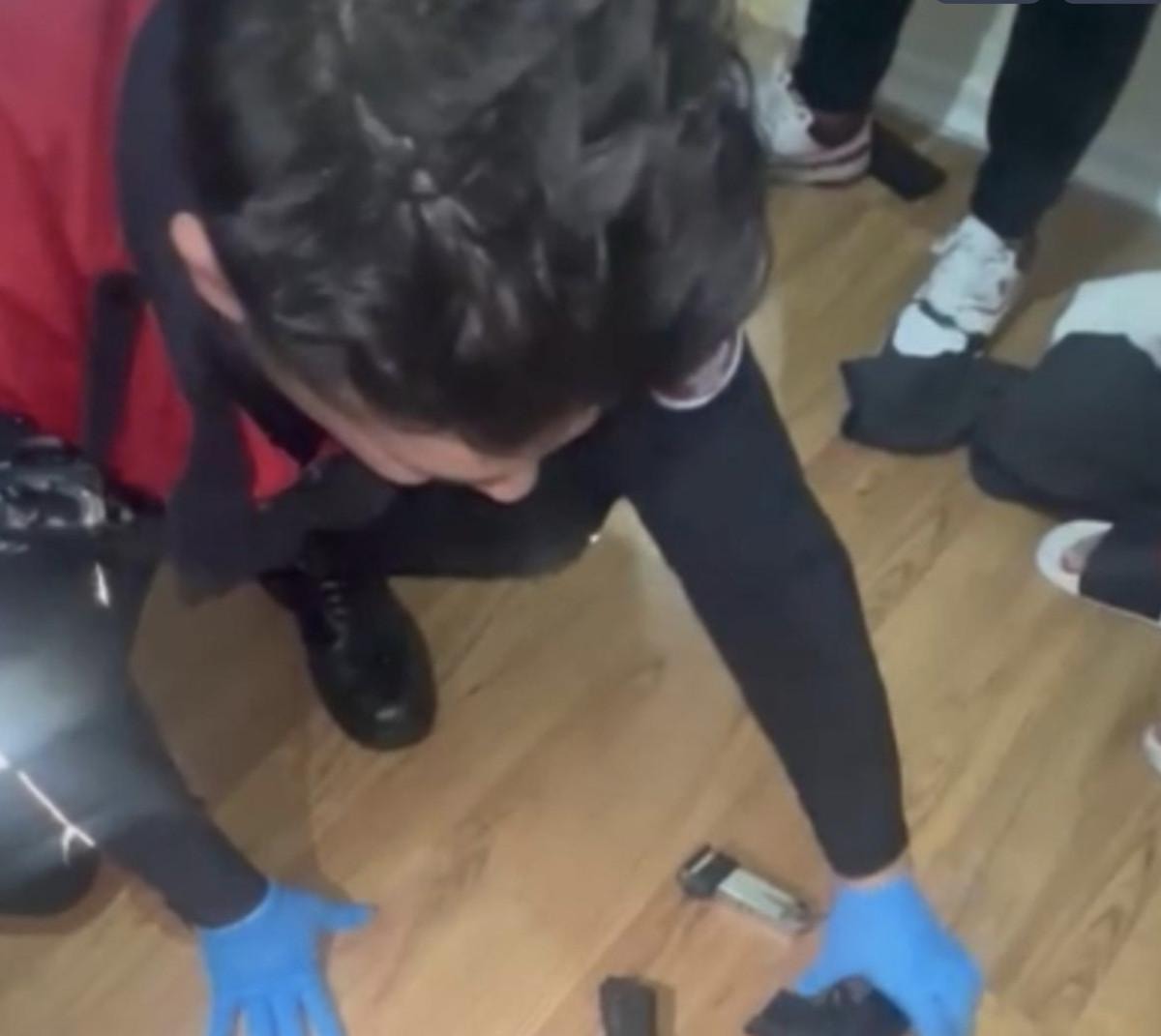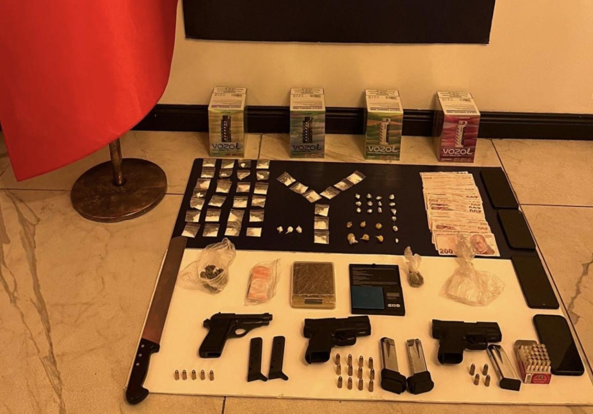 Salonda, mutfakta ve balkonda yapılan aramalarda ele geçirilen 41 adet mermi, 2 adet yedek şarjör, 6 adet MDMA maddesi, 34 adet Line maddesi, 4 adet kokain ve 4 kutu elektronik sigaraya el konuldu.
