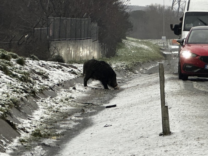 Kentte doğada yiyecek bulmakta zorlanan yaban domuzu Hasdal-Kemerburgaz yoluna indi. Burada yiyecek yiyen domuz görenlerin dikkatini çekti.