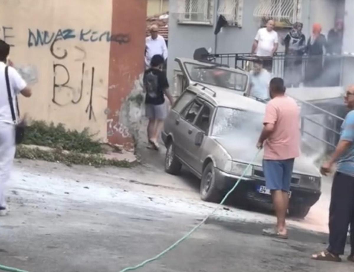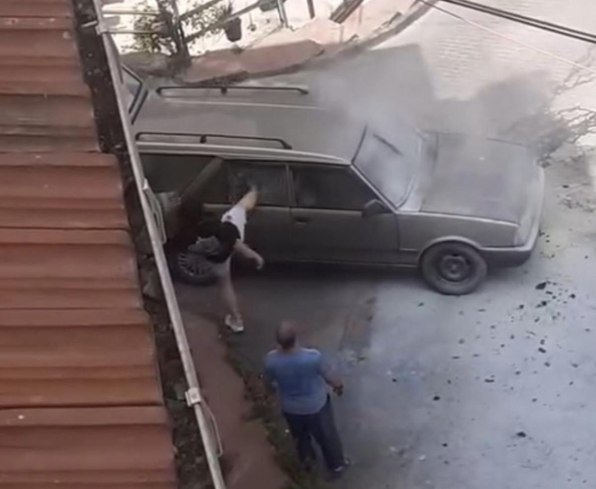Vatandaşların sakinleştirmeye çalıştığı sürücü, daha sonra aracın aynalarını yumrukladı; sileceklerini de kopararak kırdı. Sürücünün sokaktan uzaklaştırılmasının ardından vatandaşlar su döküp, hortumla su tutarak araçtaki yangını söndürdü.