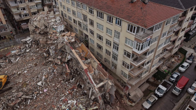 Görüntülerde binadan kopan parçalar büyük bir gürültüyle yan binanın üzerine düştüğü ve etrafı toz bulutu kapladığı görülüyor.