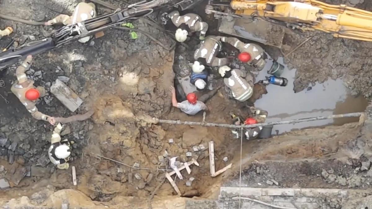 Cadde üzerinde yapılan kanalizasyon çalışmaları esnasında göçük altında kalan işçinin itfaiye ekipleri tarafından kurtarıldığı anlar havadan görüntülendi.