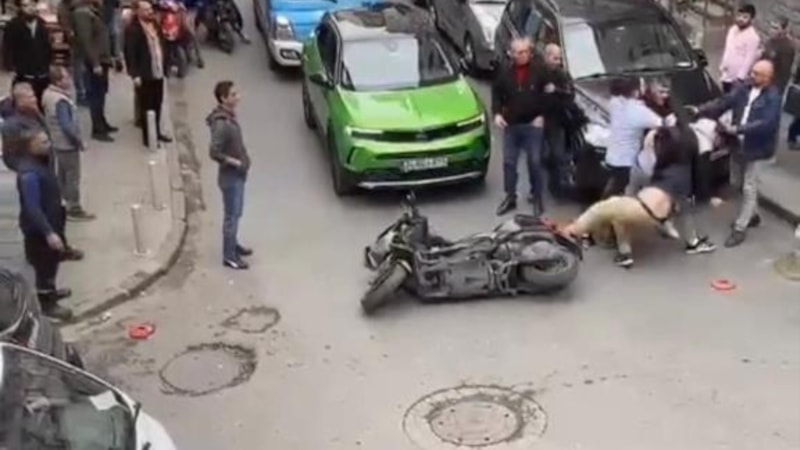 O esnada araç sürücüsü, yerde bulunan motosikleti tekmelemeye başladı.