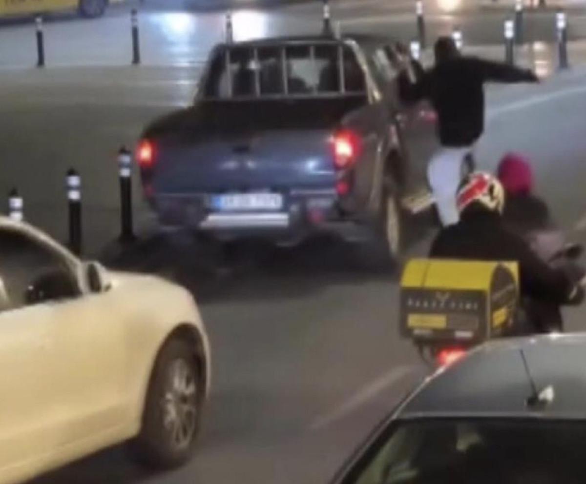 Sürücülerin birbirine girdiği, kavgaya müdahale etmeye çalışan kuryenin ise motosikletinin devrildiği anlar, bir başka sürücü tarafından cep telefonu kamerası ile kaydedildi.