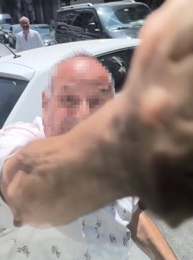 Görüntülerde, otomobil sürücüsünün sinirli bir şekilde camı yumrukladığı ve bağırarak hakaretler ettiği anlar yer aldı.
