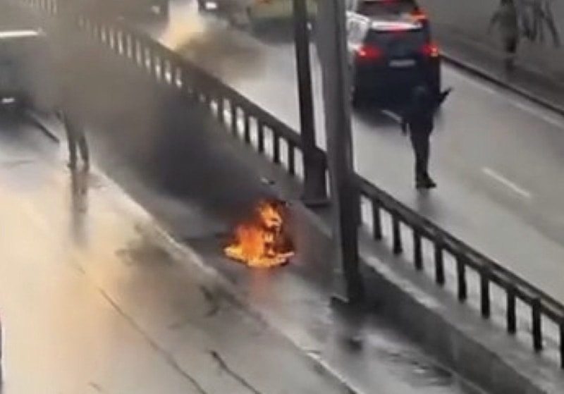 Beylikdüzü D-100 Karayolu'nda seyir halindeki bir motosiklet henüz bilinmeyen nedenle alev alev yandı. Yangın itfaiyenin müdahalesiyle söndürülürken o anlar cep telefonu kamerası ile kaydedildi.