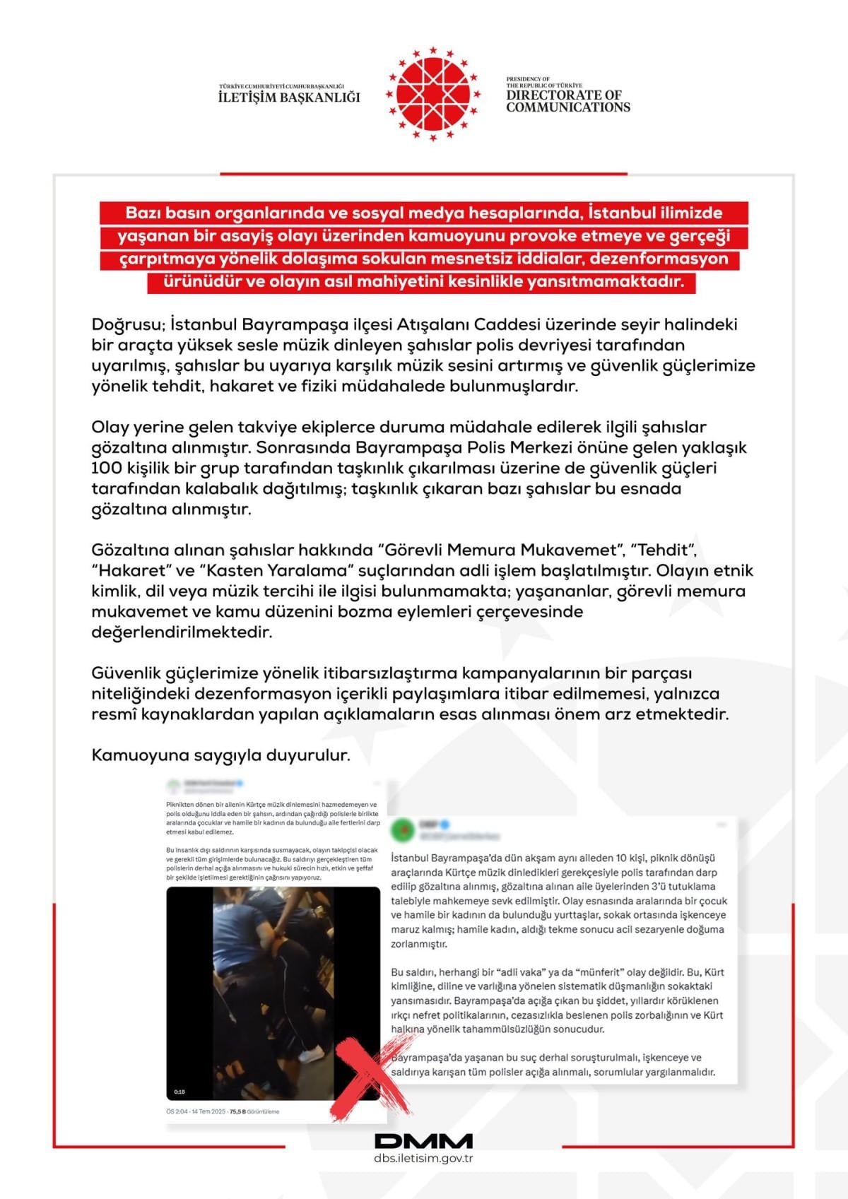 Doğrusu; İstanbul Bayrampaşa ilçesi Atışalanı Caddesi üzerinde seyir halindeki bir araçta yüksek sesle müzik dinleyen şahıslar polis devriyesi tarafından uyarılmış, şahıslar bu uyarıya karşılık müzik sesini artırmış ve güvenlik güçlerimize yönelik tehdit, hakaret ve fiziki müdahalede bulunmuşlardır. Olay yerine gelen takviye ekiplerce duruma müdahale edilerek ilgili şahıslar gözaltına alınmıştır. Sonrasında Bayrampaşa Polis Merkezi önüne gelen yaklaşık 100 kişilik bir grup tarafından taşkınlık çıkarılması üzerine de güvenlik güçleri tarafından kalabalık dağıtılmış; taşkınlık çıkaran bazı şahıslar bu esnada gözaltına alınmıştır. Gözaltına alınan şahıslar hakkında “Görevli Memura Mukavemet”, “Tehdit”, “Hakaret” ve “Kasten Yaralama” suçlarından adli işlem başlatılmıştır. Olayın etnik kimlik, dil veya müzik tercihi ile ilgisi bulunmamakta; yaşananlar, görevli memura mukavemet ve kamu düzenini bozma eylemleri çerçevesinde değerlendirilmektedir.