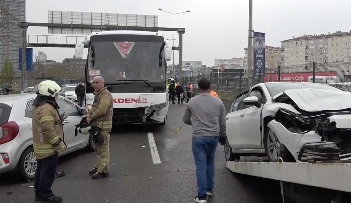 İçindeki yolcularla beraber ilerleyen yolcu otobüsü de kaza yapan otomobile duramayarak çarptı.
