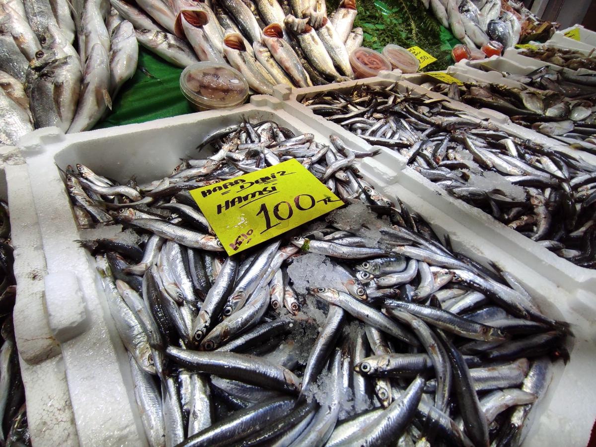 Karaköy Tarihi Balıkçılar Çarşısı'nda; hamsi 100 lira, istavrit 80 lira, çinekop 200 lira, palamut 80 lira, barbun 300 lira, tekir balığı 200 lira, mezgit 100 liradan satılıyor.