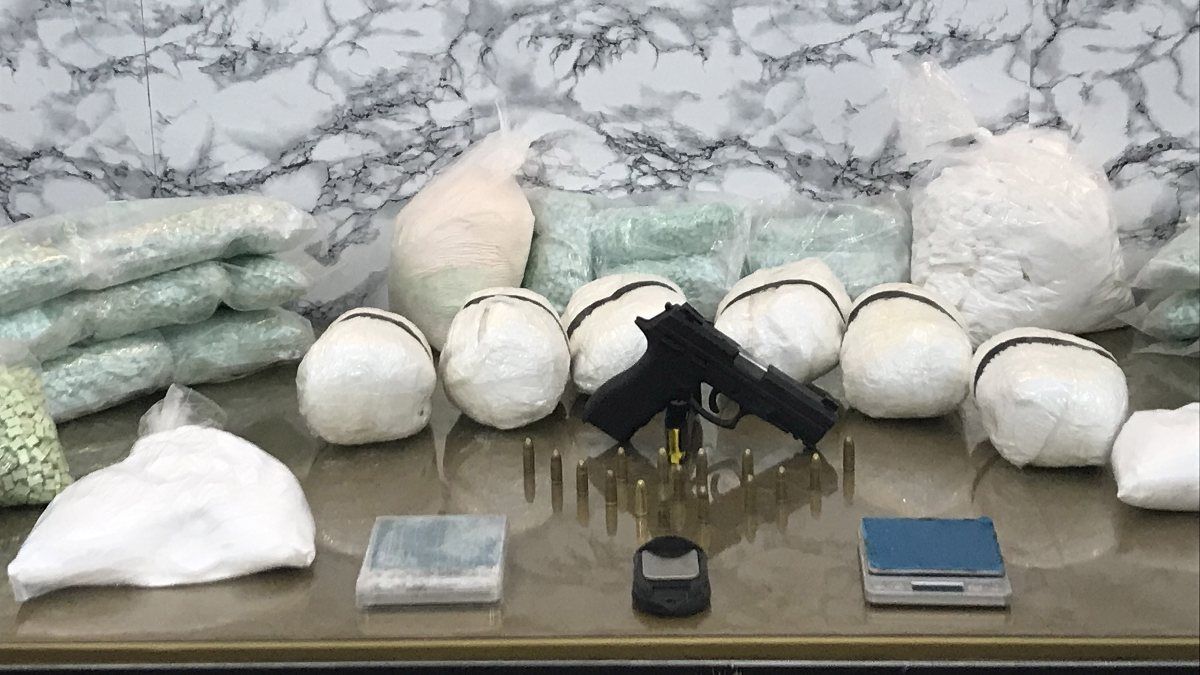 Baskın yapılan adreslerde 128 bin 960 adet extacy hap, 9 kilo 172 gram kokain, 1 kilo 960 gram metamfetamin maddesi, uyuşturucu ticaretinde kullanıldığı sanılan 6 hassas terazi, 1 ruhsatsız tabanca ve bu silaha ait 16 fişek ele geçirildi.