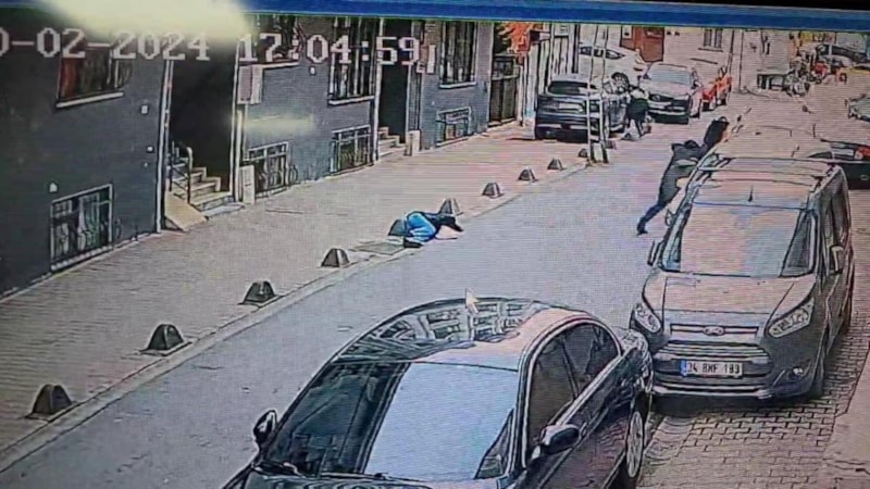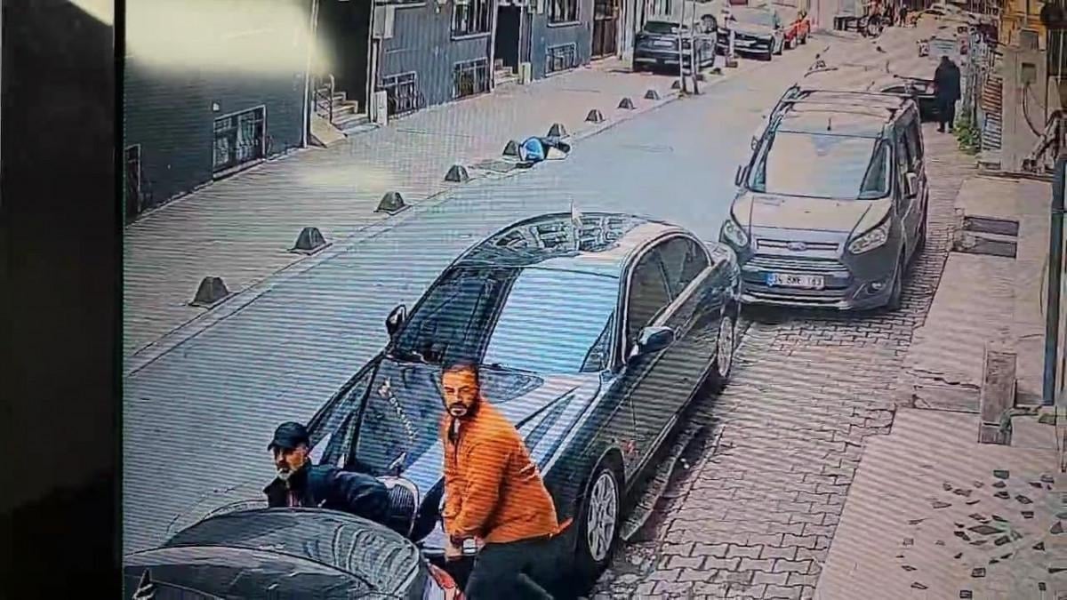 Sokaktakiler silah sesleri duyup kaçışırken, bir kişinin otomobilin kenarında eğilerek kendini korumaya çalıştığı görülüyor.
