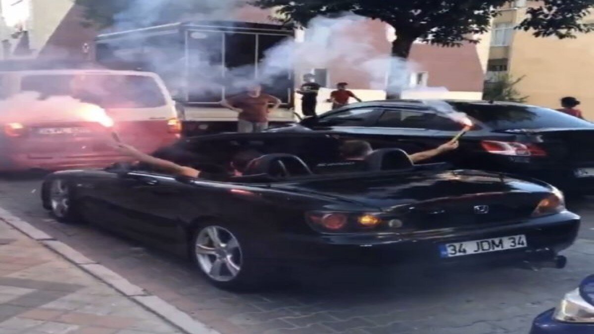 Eğlencenin ardından ultra lüks araçlarına binerek konvoy halinde trafiğe çıkan grup, çakarlı araçlarla “dat dat” sistemini kullandı. Gürültü yaparak çevreye rahatsızlık veren grup, ellerine aldığı meşalelerle de ortalığı dumana boğarak trafiği tehlikeye düşürdü.