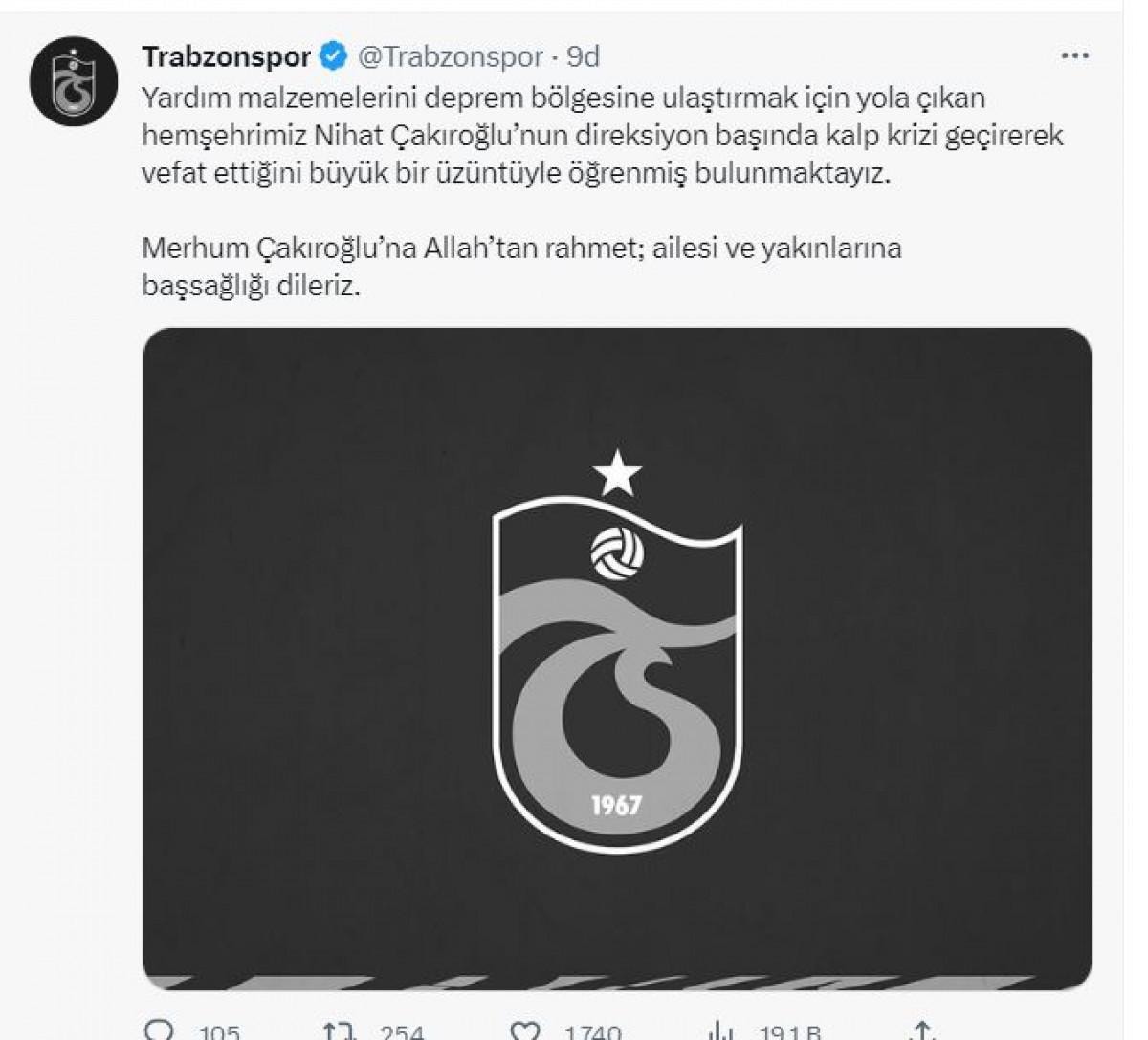 Öte yandan Trabzonspor da acı haberi sosyal medyadan paylaştı: