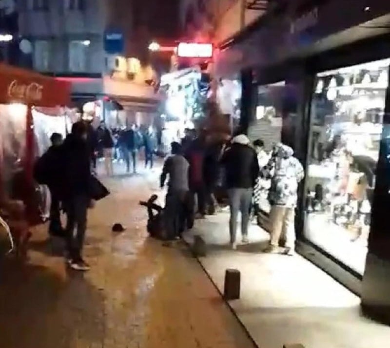 Bir kişi, yere düşürdüğü kişiyi art arda darbetti. Gruptaki başka bir kişi ise yerdeki kişiye tekme atarak kaçtı.