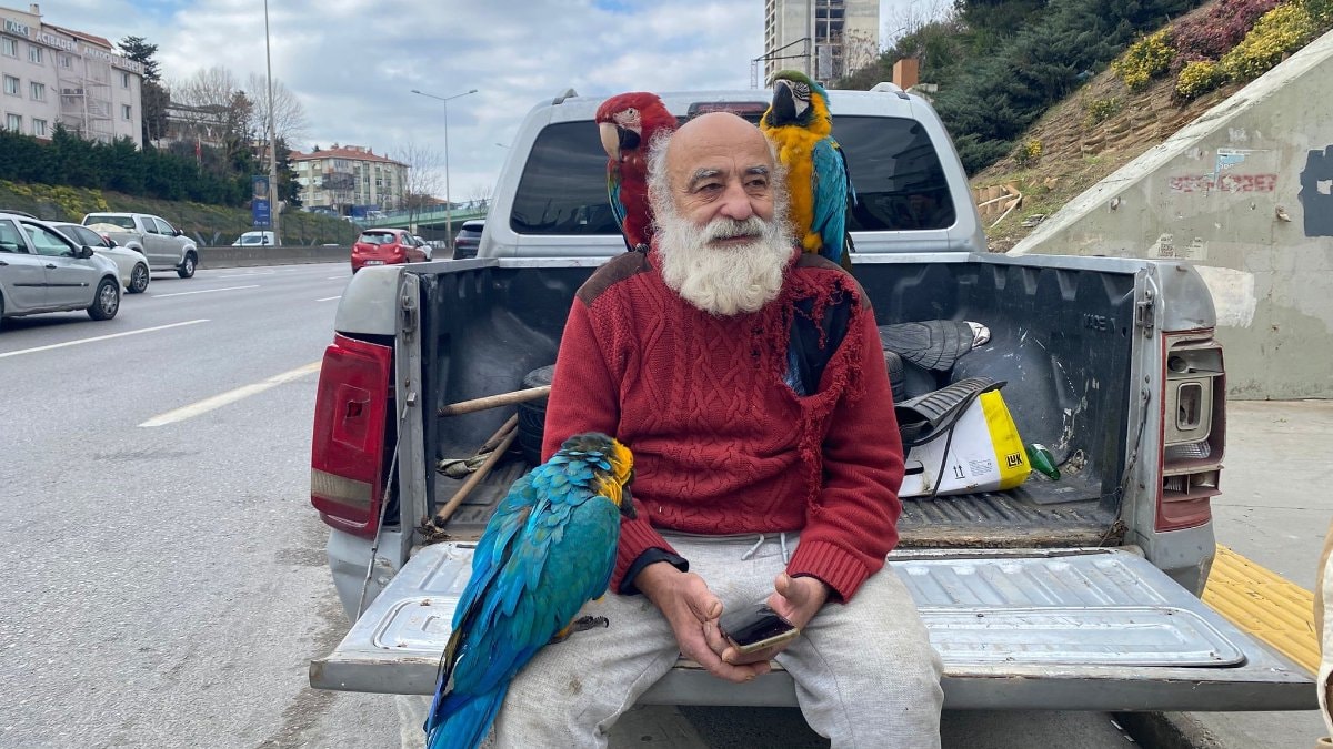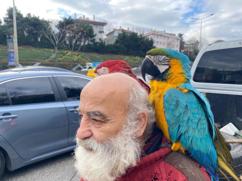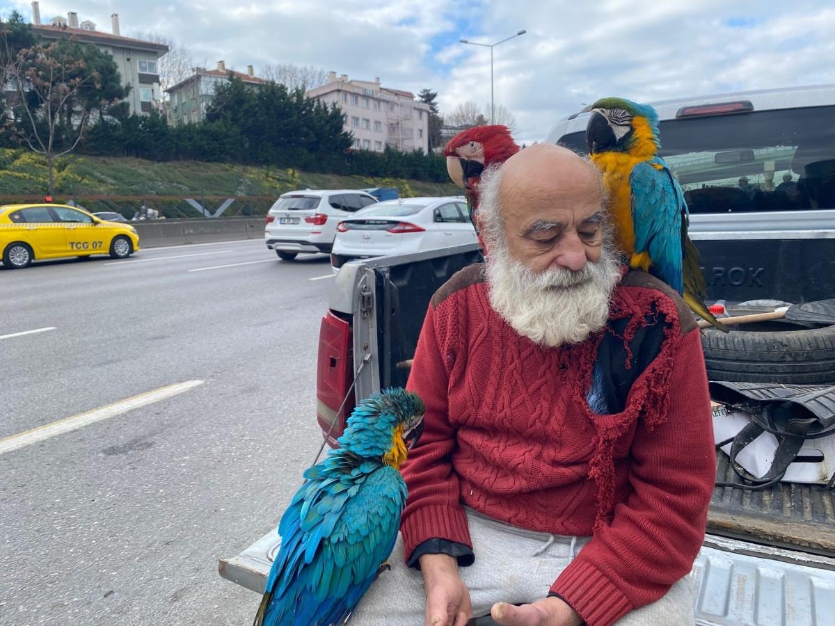 İstanbul'un Beykoz ilçesinde yaşayan 70 yaşındaki İsmail Karamustafa, gün içinde şehrin sembol ilçelerinde omzunda kendi yetiştirdiği papağanlarla gezintiye çıkıyor.